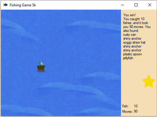 Code to create a simple fishing game that allows a graphic "character" - in this case a boat - to move around an area in a Windows Forms Application. With each movement random events can happen such as catching a fish.