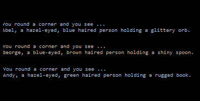 Console.WriteLine(Name + ", a " + EyeColor + "-eyed, " + HairColor + " haired person holding a " + ObjectAdjective + " " + Object