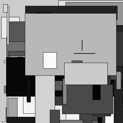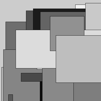 A randomized composition maker that will create shapes of a random size, filled with a random shade of grey, and place them in a random spot within the display window. The fill() function is passed a random number between 0 and 255 to determine the shade of grey. A rectangle is then created with the rect() function, passing in random numbers from 0 to the display width and height to determine the size, and random locations within the display window.